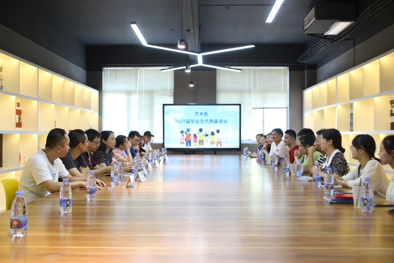 2021年6月22日下午,艺术系2021届毕业生座谈会在系会议室召开,师生欢聚一堂。艺术系党总支书记杨扬、系主任权凌枫、团支部书记何妮、辅导员朱衍、专业老师代表、毕业生代表、在校生代表参加座谈会。