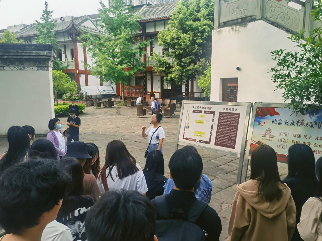 在活动中,设计团队师生先后参观了李杜祠、富乐堂、朝阳厂等具有代表性的文化景点,李杜社区的范书记从富乐街道的历史、发展、现状,以及各文化景点文化历史、文化内涵等方面进行了详细的讲解。通过此次的调研学习,师生们深入了解了富乐深厚的人文底蕴、丰富的自然资源,有效促进了师生们对富乐街道的李杜文化、三国文化、三线文化及当地的非遗手工艺等传统文化知识的深入了解,有利于在后期设计中充分挖掘富乐特色,汲取创作灵感和收集设计素材。