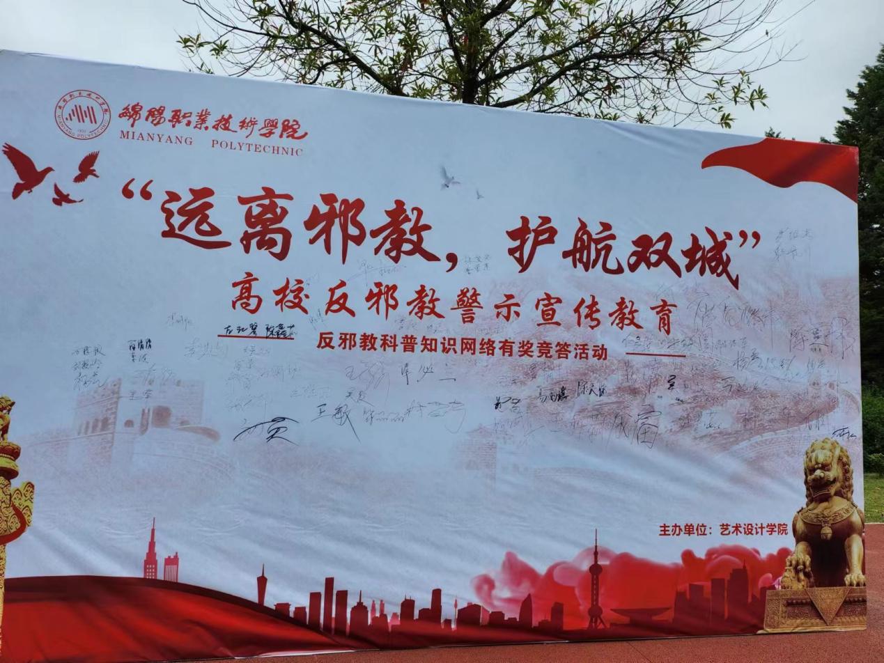 川渝高校反邪教警示宣传教育暨反邪教科普知识网络有奖竞答活动是中央政法委评定的反邪教警示宣传“一省一亮点”金国示范项目。根据项目实施方案,5月11日上午,艺术设计学院开展了以“远离邪教,护航双城”为主题的反邪教警示宣传教育签名活动。以此次活动为契机,防范邪教向高校渗透,提高师生对于邪教的识别能力,是贯彻落实党的二十大精神、推动成渝地区双城经济圈建设走深走实的重要工作,也是维护高校意识形态安全、保护师生身心健康的重要举措。